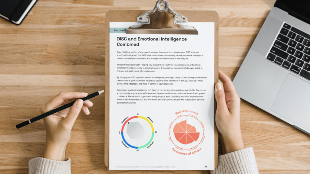 Discflow adds emotional intelligence (EI) so people see not only “what I’m like” but “how I self‑manage and relate to others”. This includes things like self‑awareness, impulse control, empathy and how effectively someone adapts their style in different situations.