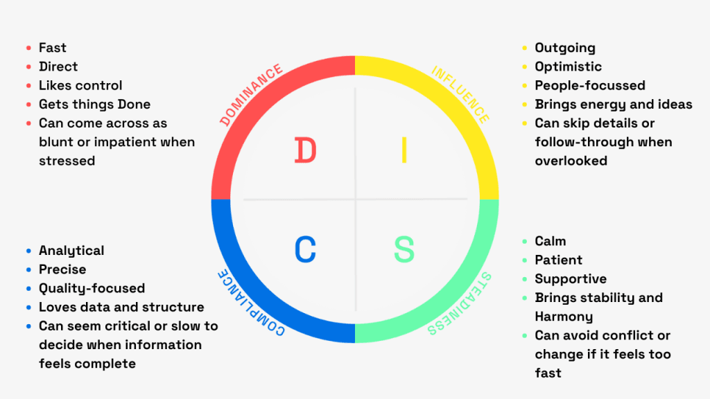 Discflow takes the classic DISC model and combines it with key aspects of emotional intelligence to help people work together with more awareness and less friction. It gives a simple, colour-by-numbers way to understand behaviour while also highlighting how someone manages their emotions and relationships at work.