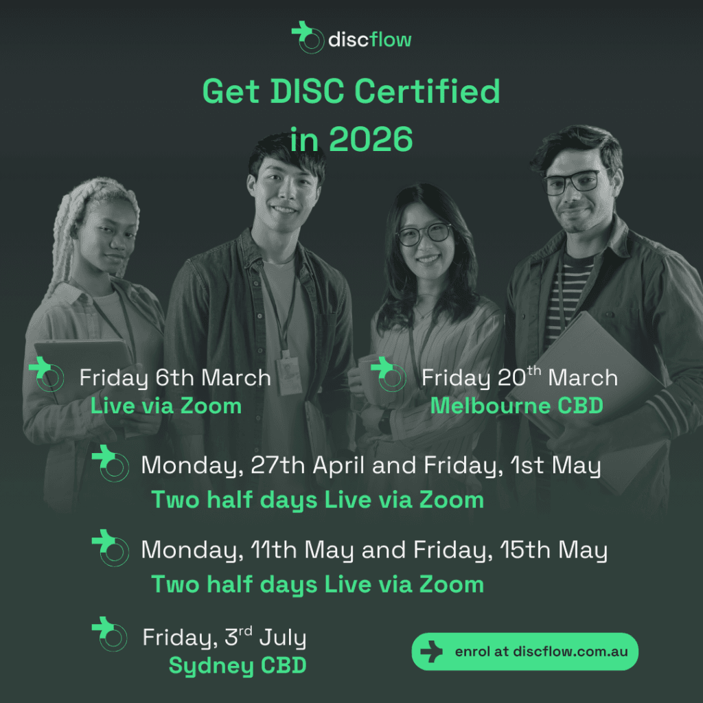 At Discflow Australia we provide everything from Discflow Reports, DISC Certification and DISC Workshops. Check out our website for info: www.discflow.com.au or get in touch: jess@discflowpapac.com