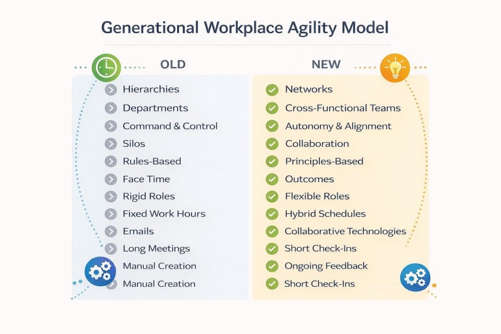 To help you start flexing, the model below shows a simple side-by-side comparison of how work was traditionally done and what newer generations increasingly expect highlighting where you can adapt how work gets done.